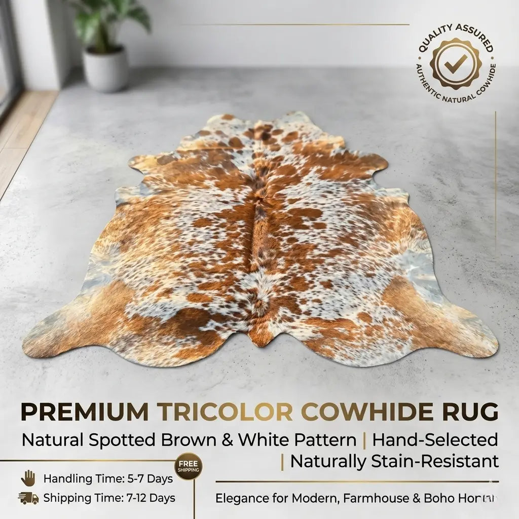 Genuine Tricolor Cowhide Rug – Natural Brown, White & Speckled Pattern