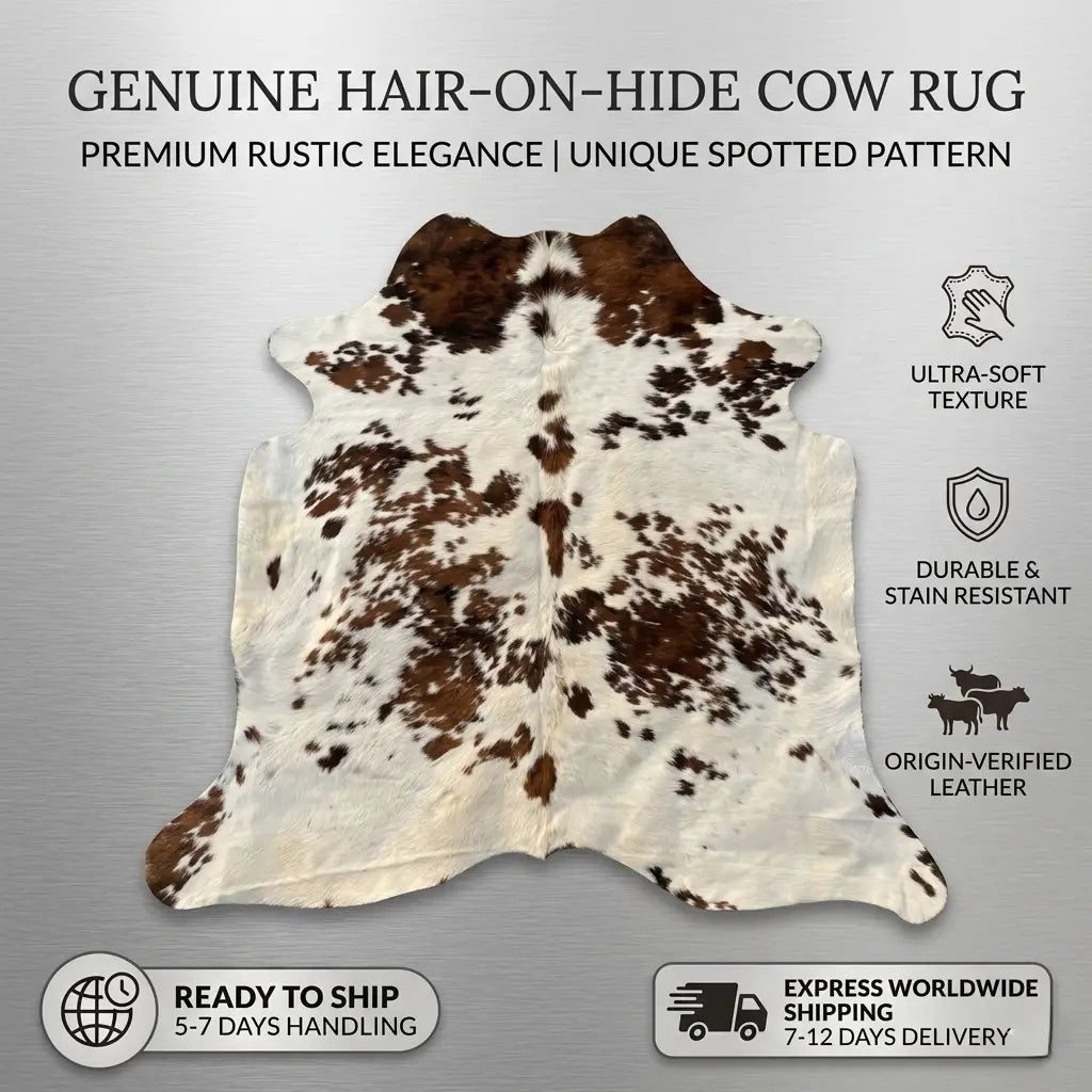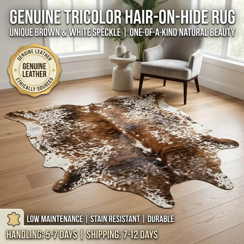 Elevate your interior with the rustic elegance of our Genuine Tricolor Hair-on-Hide Rug. Each piece...