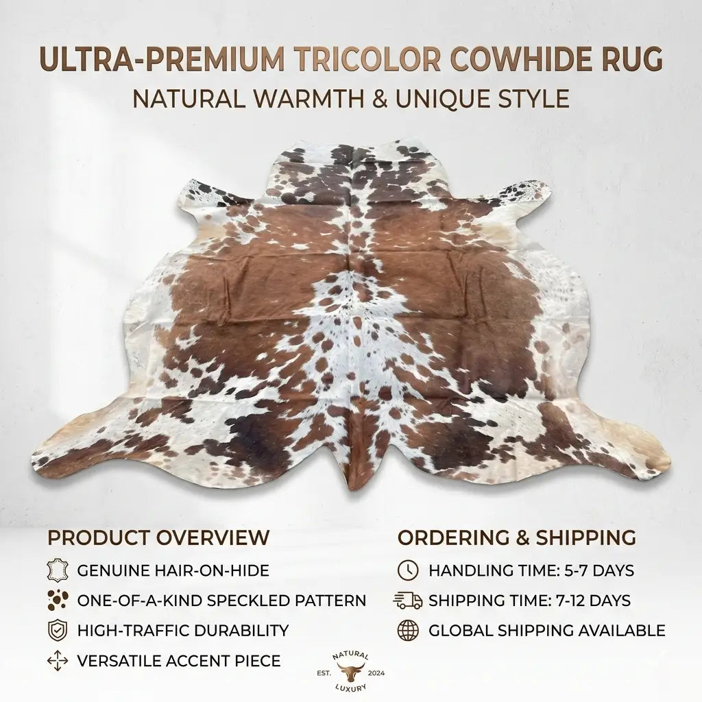 Elevate your living space with the raw, natural elegance of our Authentic Tricolor Cowhide Rug....
